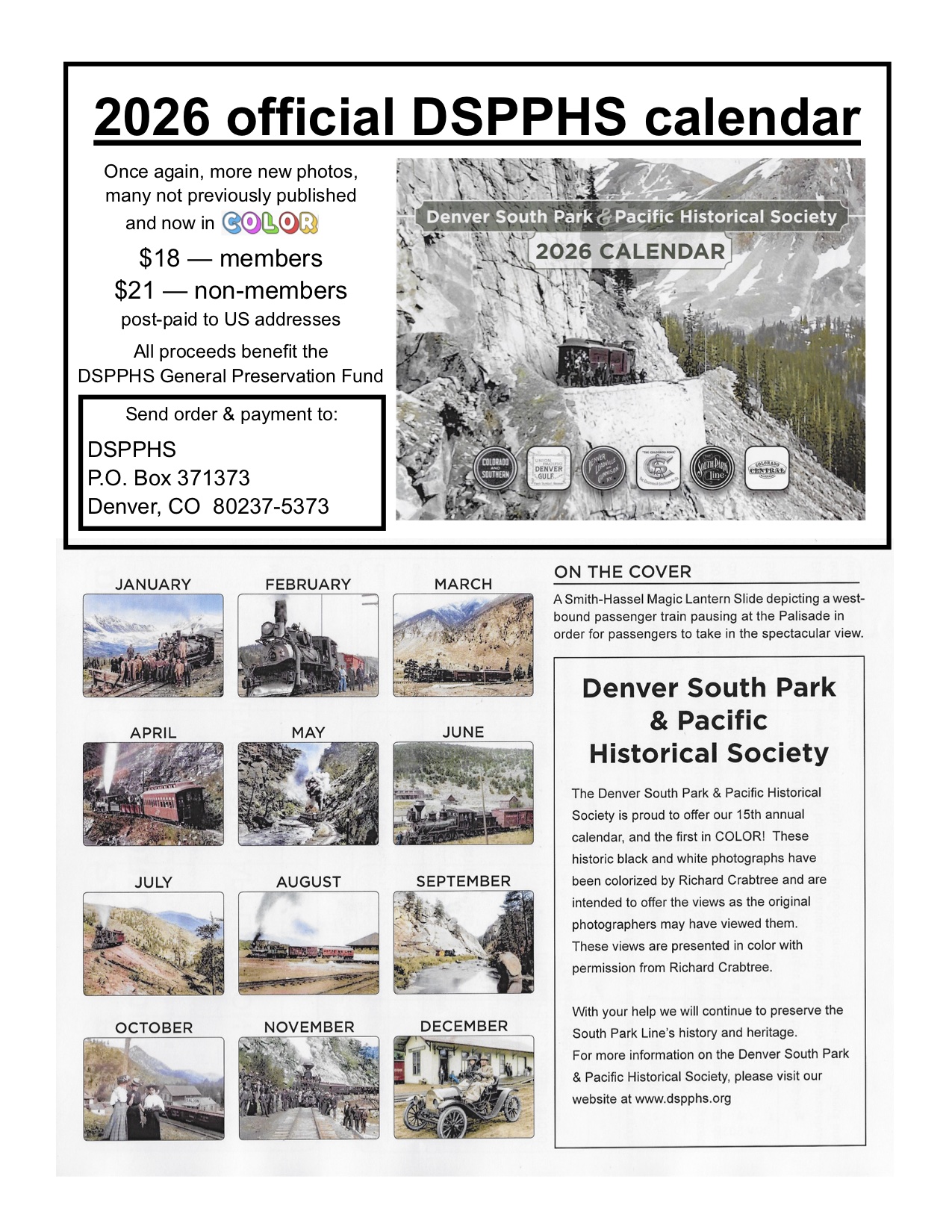 To order, send the price of the selected size plus $10 per order for shipping to the DSP&P Historical Society, P. O. Box 371373, Denver, CO 80237-5373. Make checks out to DSP&P Historical Society.