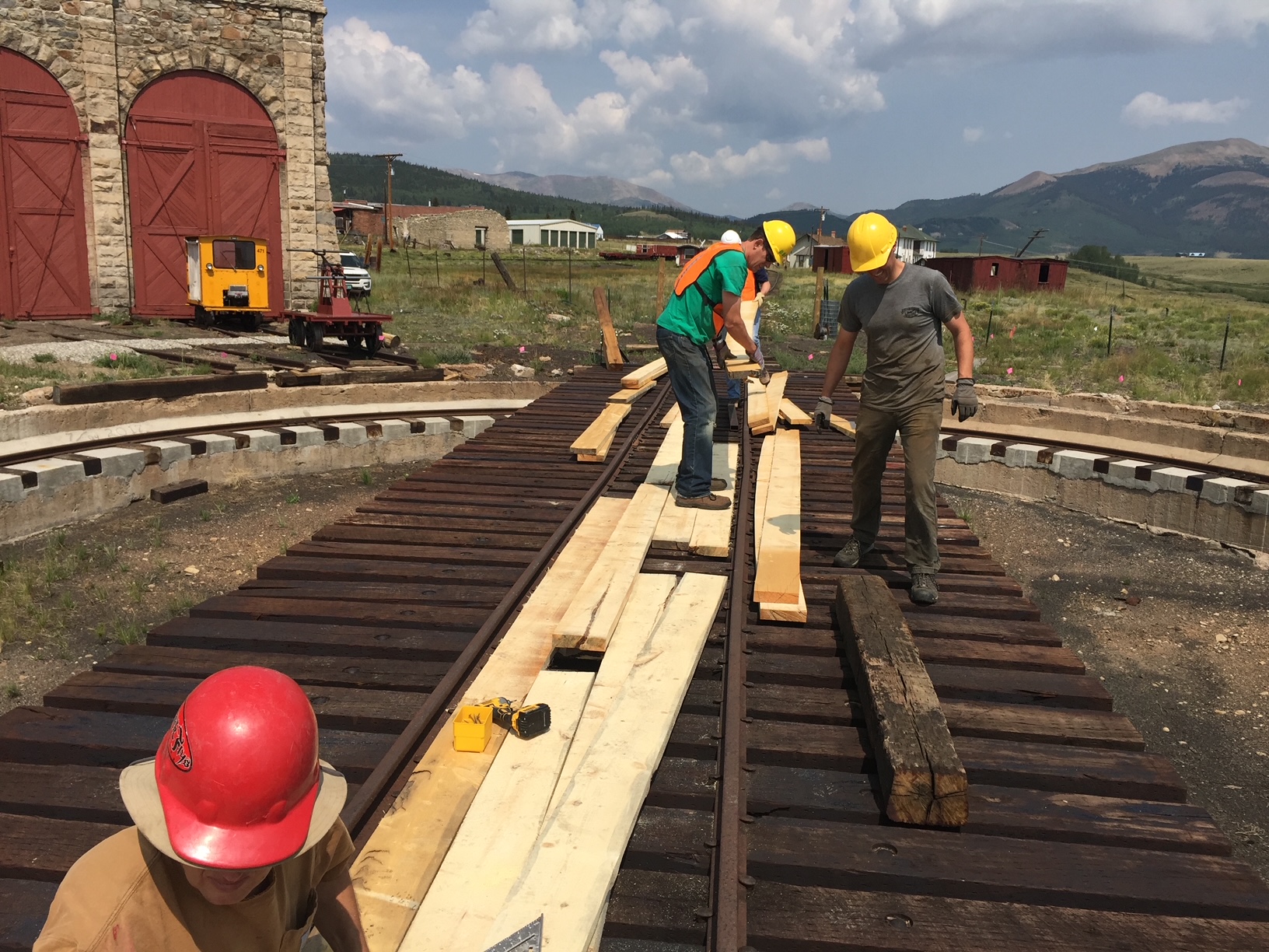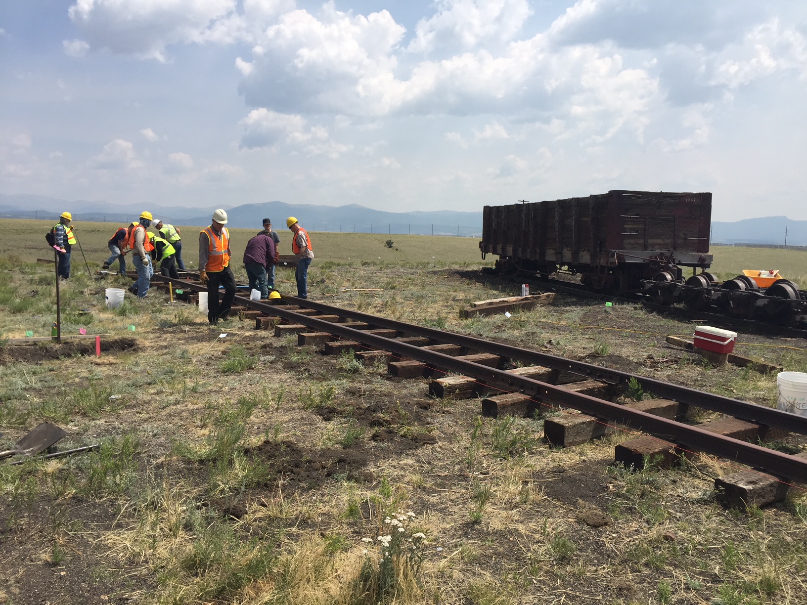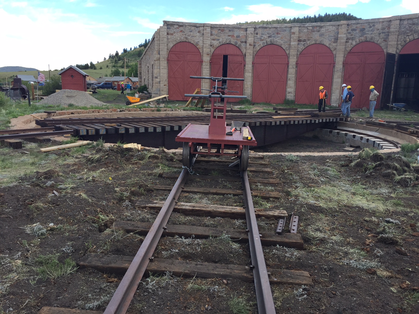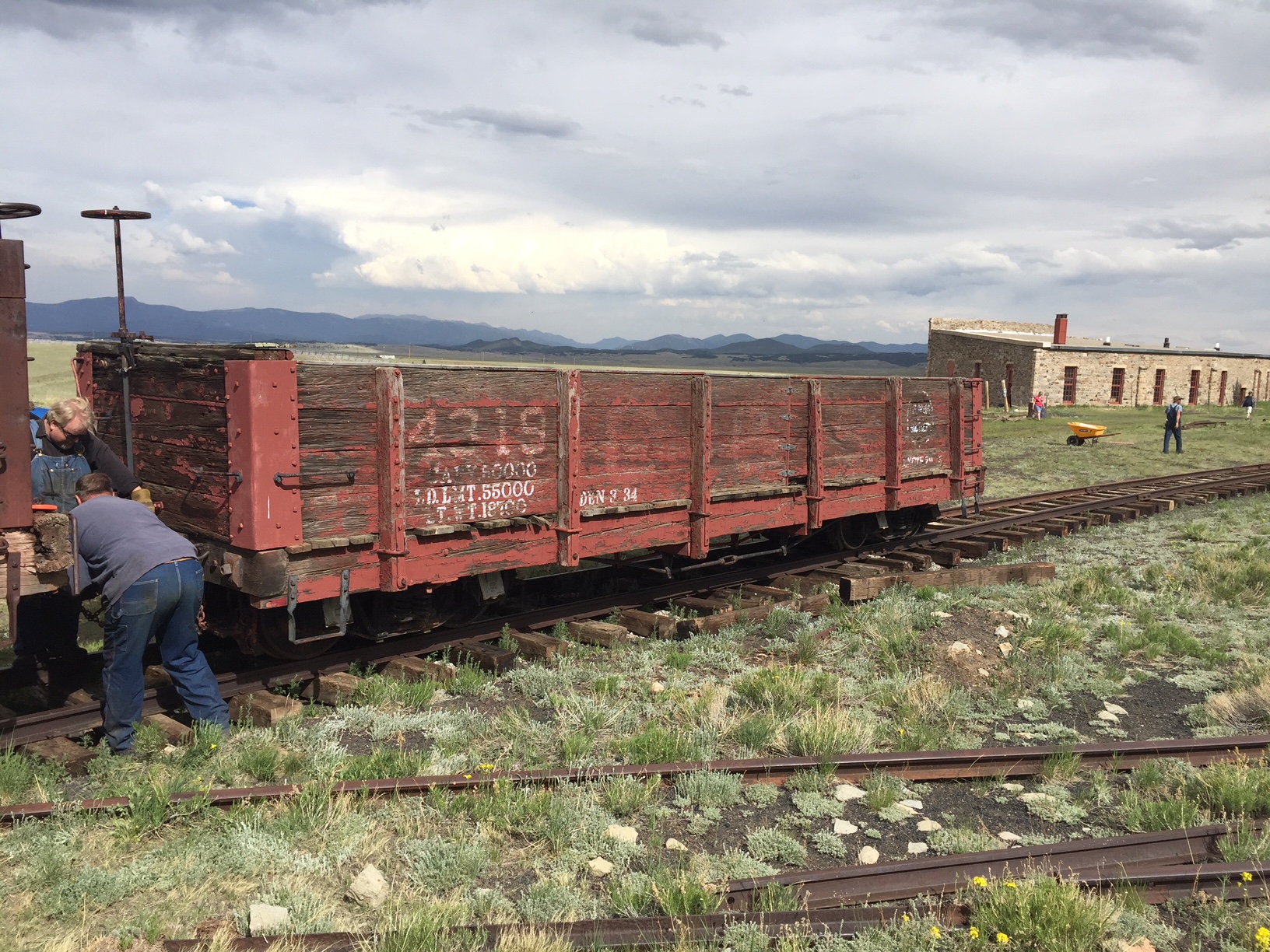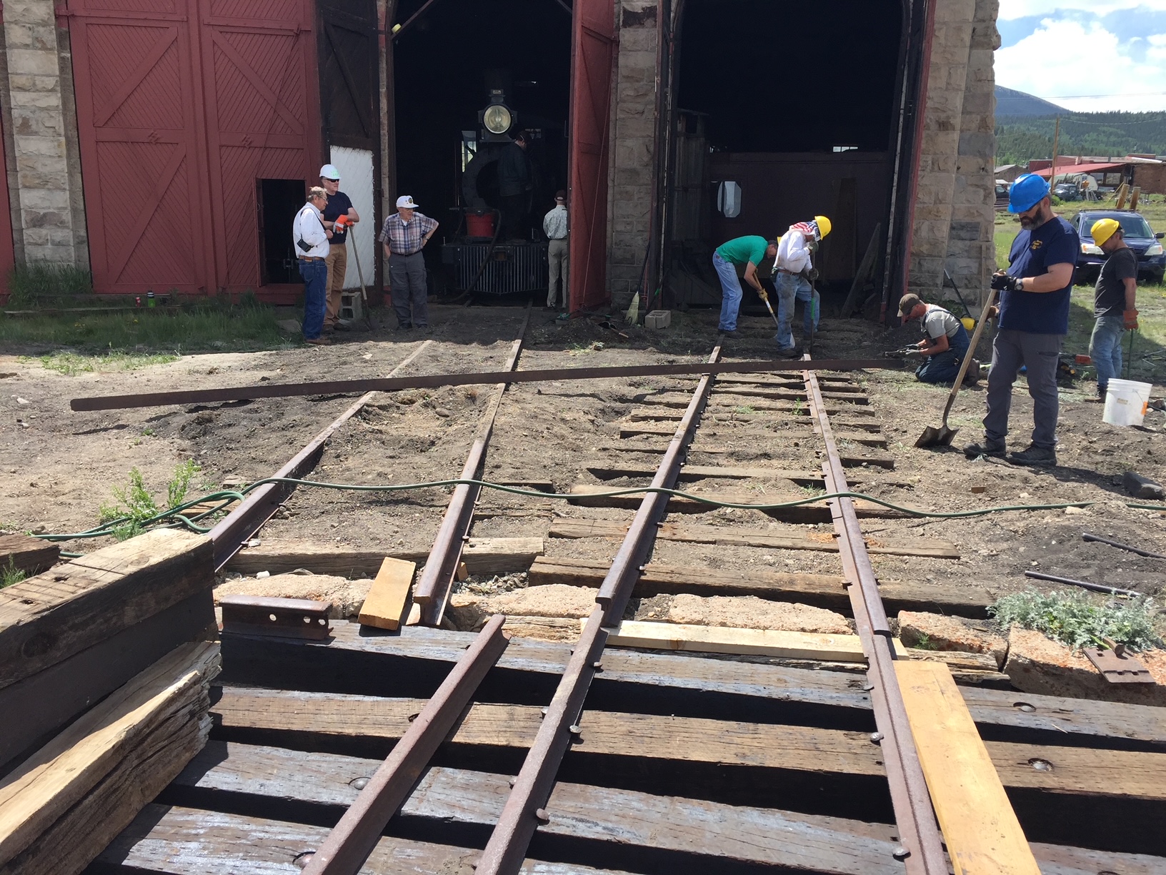 The first five pictures are from the week of 3 June to 10 June. They show overruns on tracks 2 and 5 from the roundhouse, along with new track into stall 6. We also extended the track west of the depot by 60 feet and the Gunnison main by 200 feet. Also there is a picture of C&S gondola 4319 which we got from Central City under a 10 year lease. We will restore the car and keep it in the roundhouse.